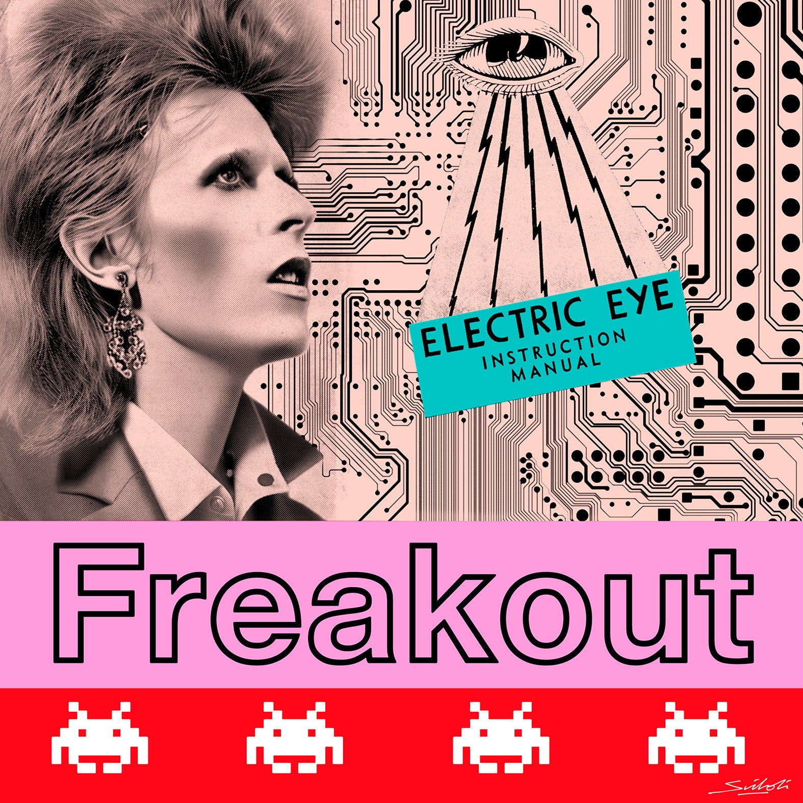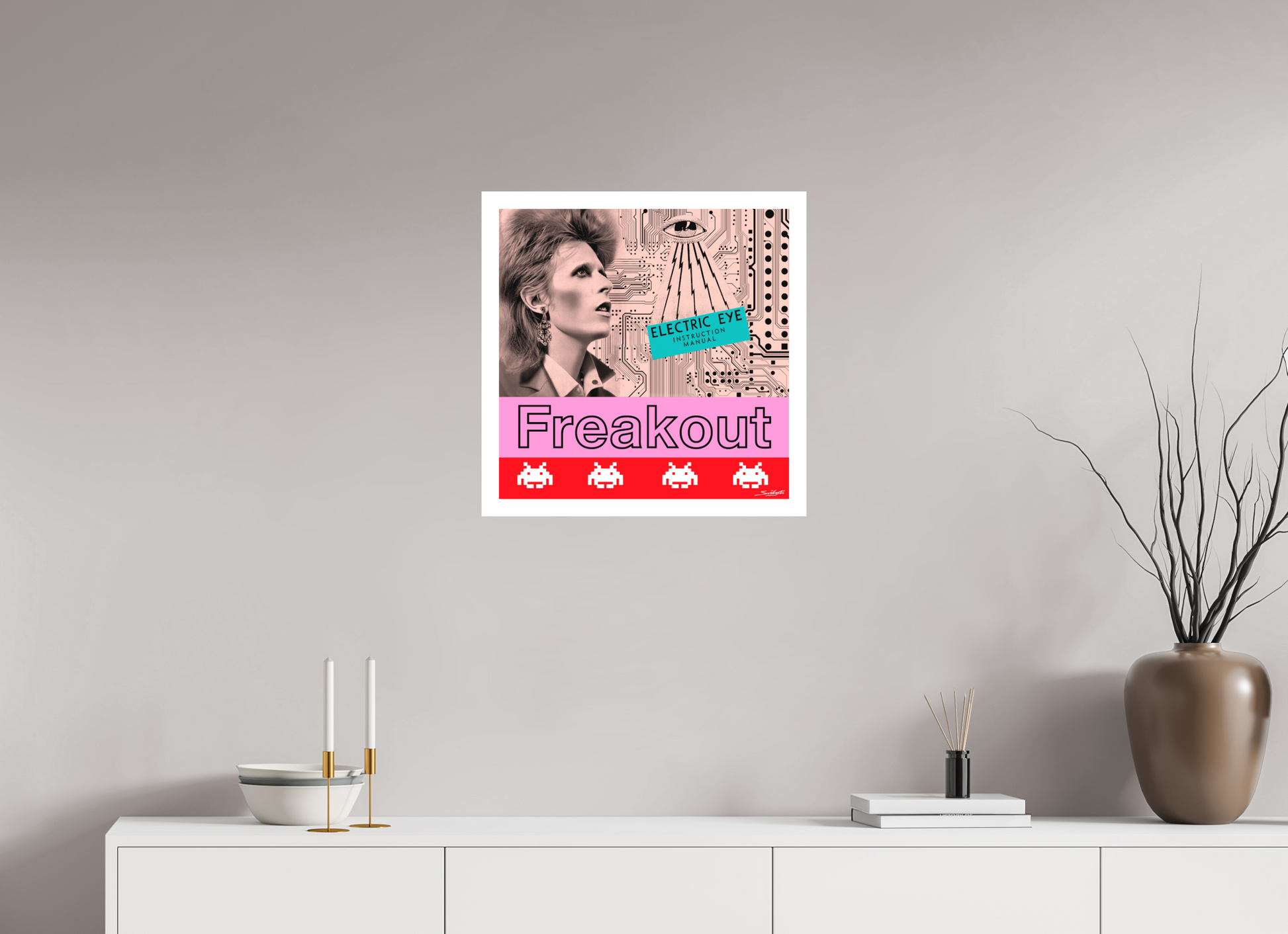 The backdrop is a striking maze of electronic circuit boards, and nestled within this futuristic landscape, you'll discover the enigmatic presence of an "electric eye" operating manual, hinting at the mysterious narrative of “Moonage Daydream” lyrics. The split-screen storytelling present in this piece represents one of Bowie's most celebrated tracks, "Moonage Daydream," from the seminal Ziggy Stardust album of 1972. Through an interplay of space invaders and bold graphics, this artwork encapsulates the individuality and mystique that Bowie effortlessly conjured during his glam rock pinnacle.